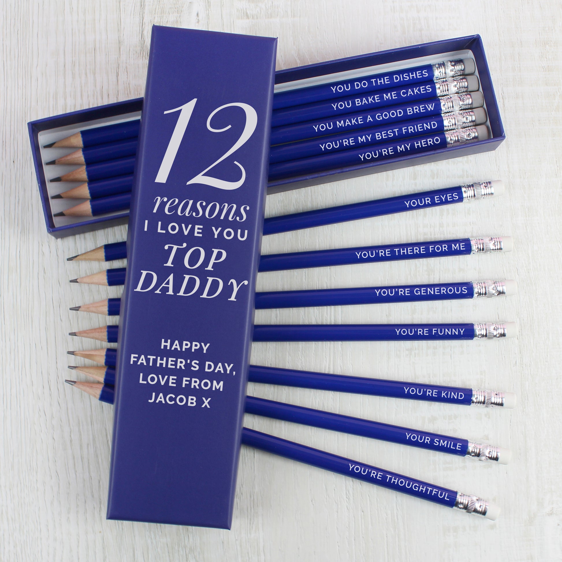 Personalised 12 Reasons Box and 12 Blue HB Pencils