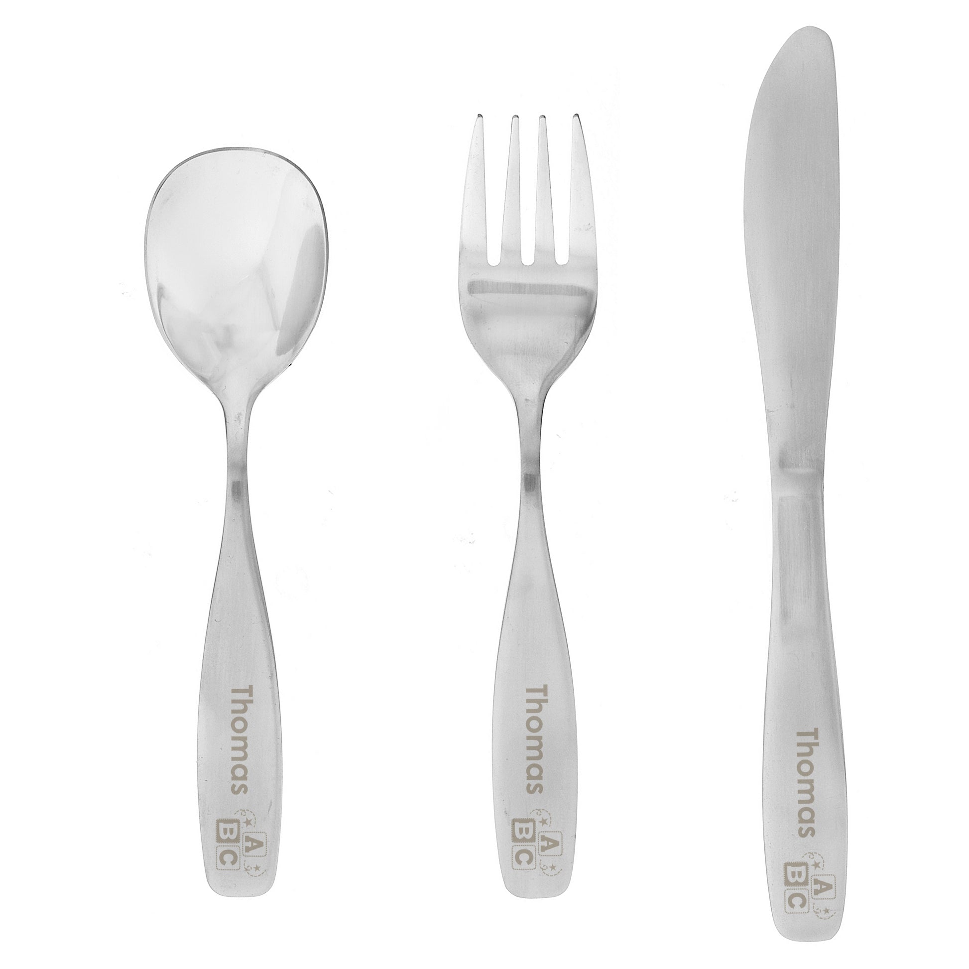 This stainless steel cutlery set can be personalised with any name up to 15 characters.