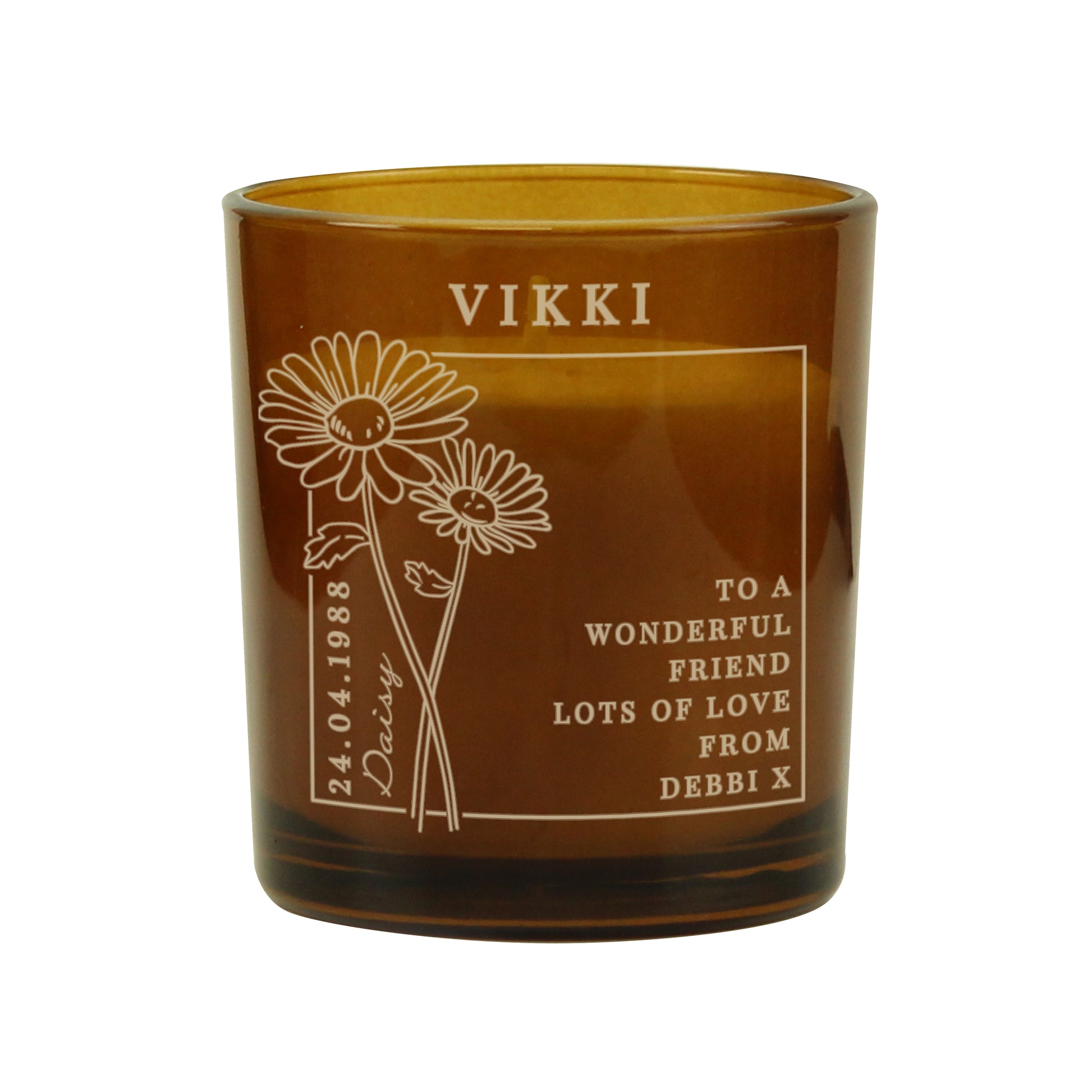 Our personalised April Birth Flower amber glass vanilla scented candle jar is the perfect gift for commemorating a Birthday!