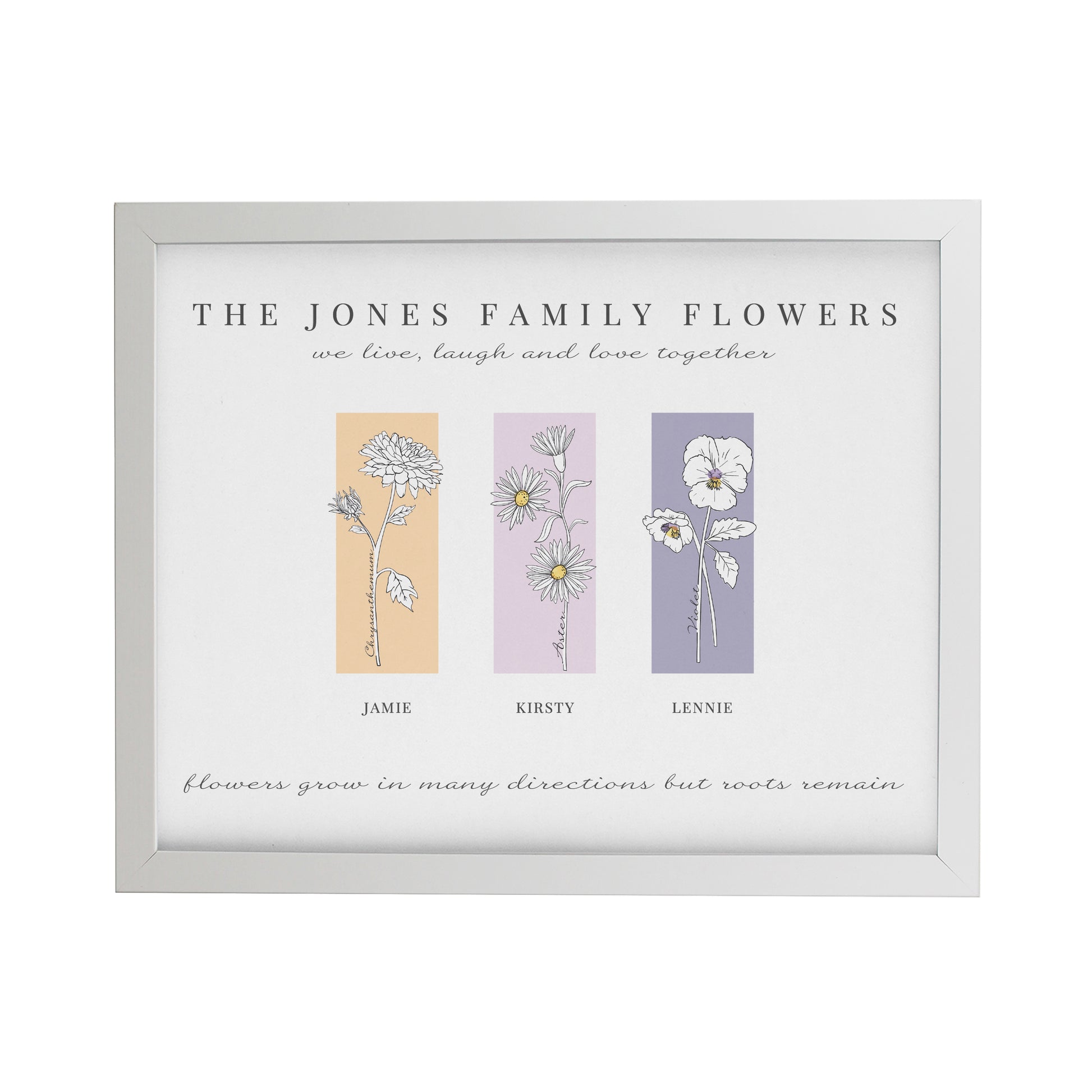 This unique framed print can be personalised with 2 message lines along the top, 3 flowers below, each with a name underneath and finally a message underneath of up to 50 characters.