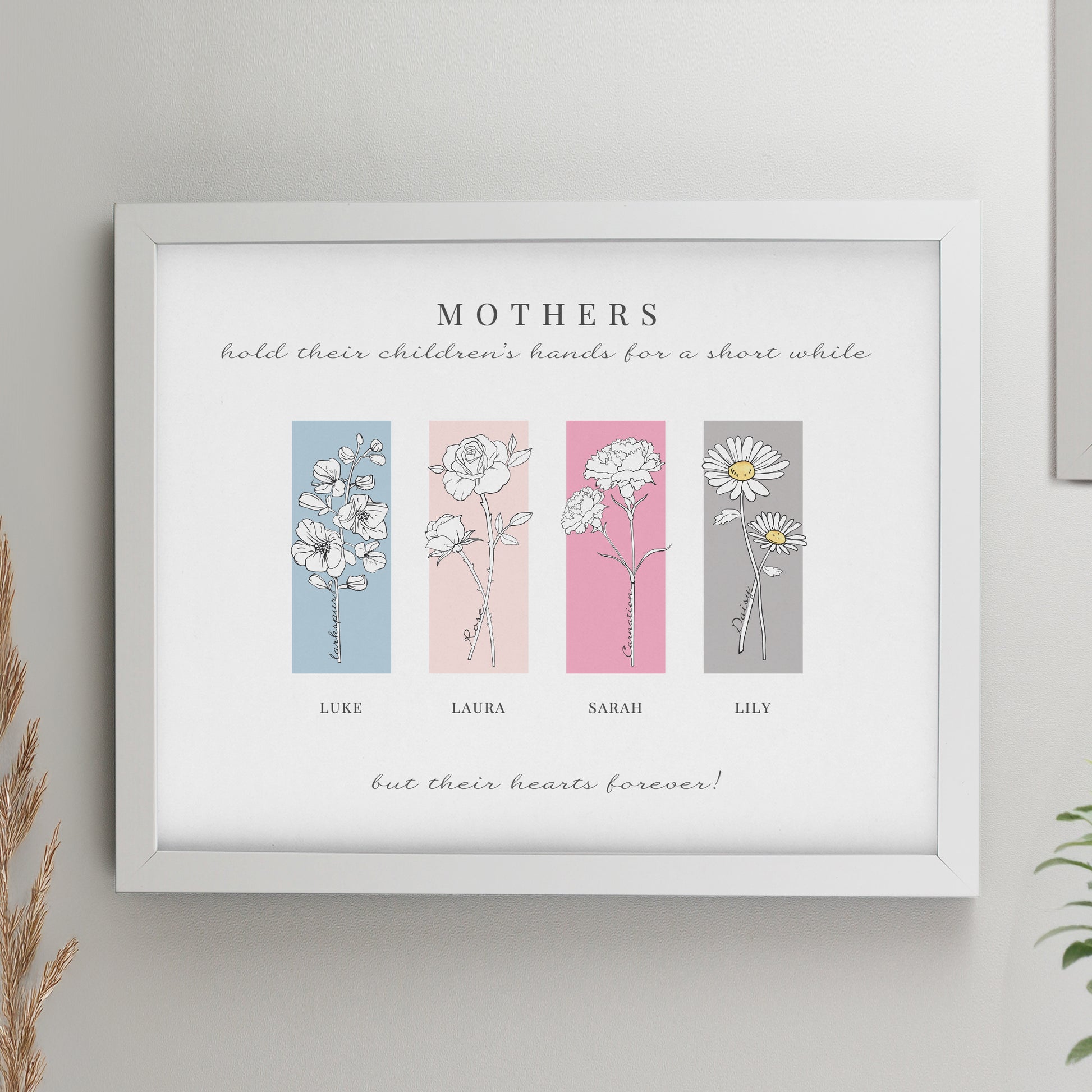 This unique framed print can be personalised with 2 message lines along the top, 4 flowers below, each with a name underneath and finally a message underneath of up to 50 characters.