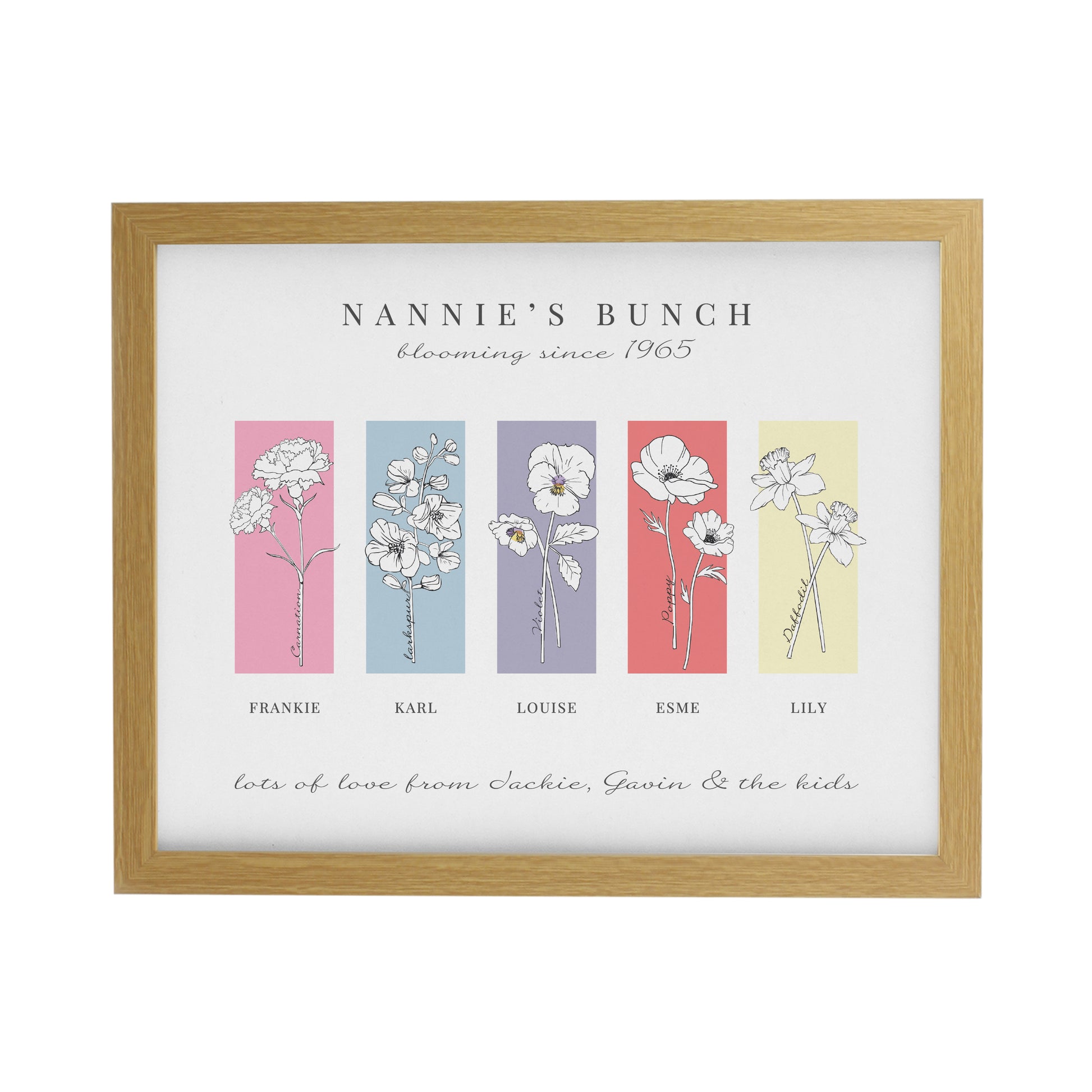This unique framed print can be personalised with 2 message lines along the top, 5 flowers below, each with a name underneath and finally a message underneath of up to 50 characters.