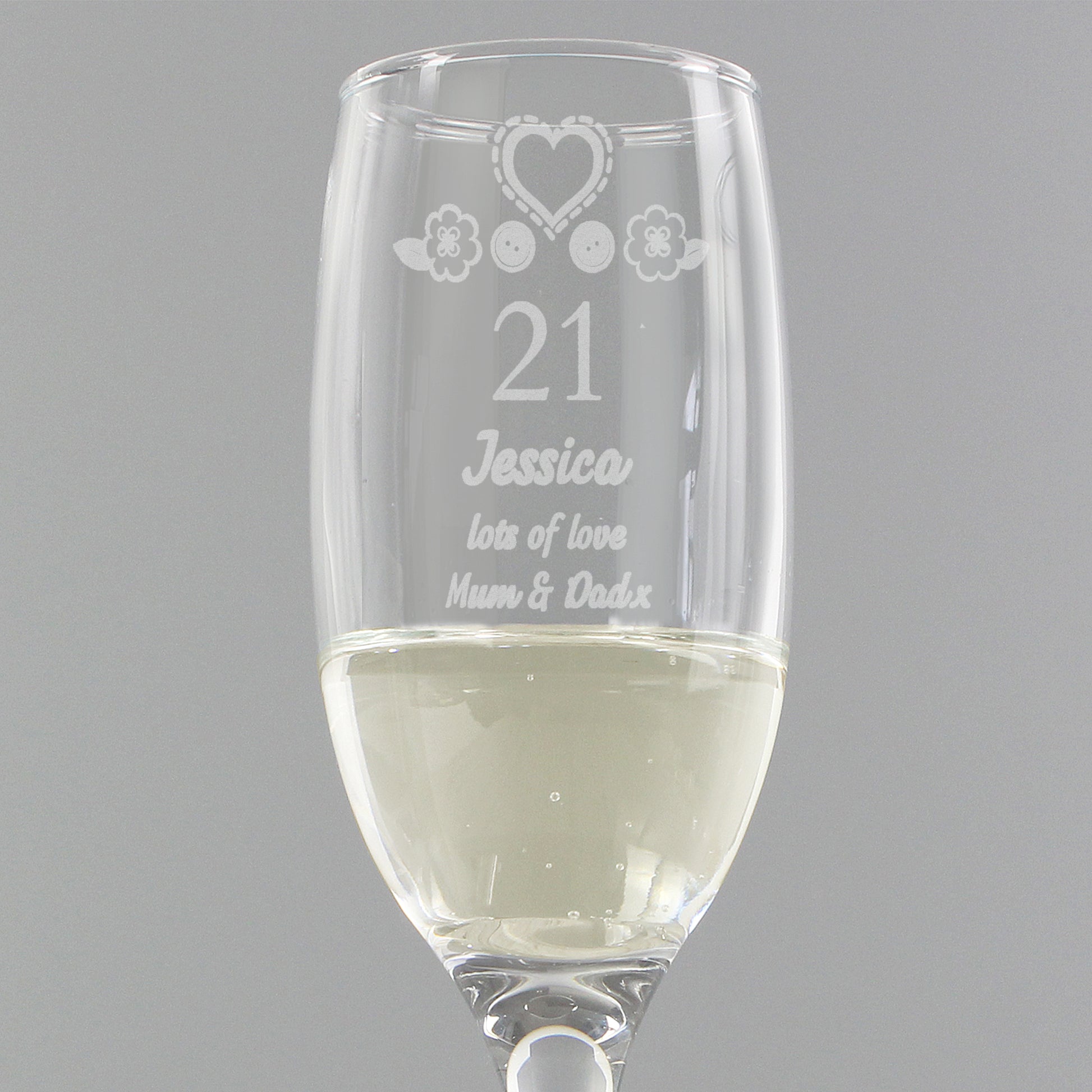 Personalise this elegant flute with an age up to 2 characters, a name up to 12 characters and with two lines of a message up to 15 characters each.