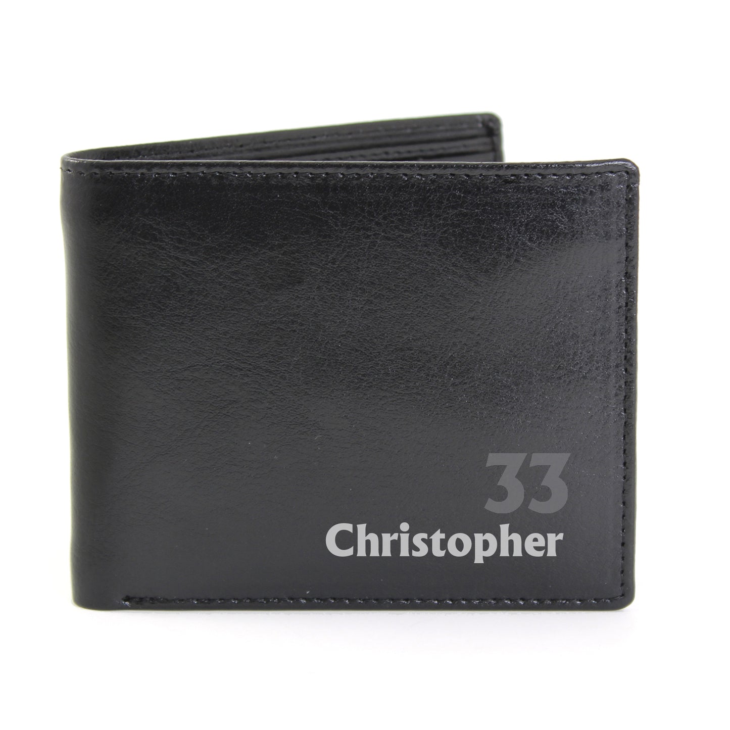 Personalise this leather wallet with any name of up to 12 characters, and an age of up to 2 characters.
