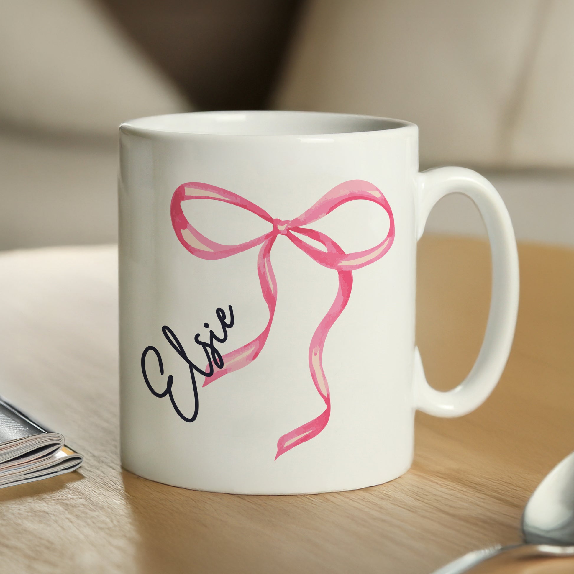 Whether it's for yourself or a thoughtful gift, this adorable mug features a stylish bow design and your selected name, making it unique.