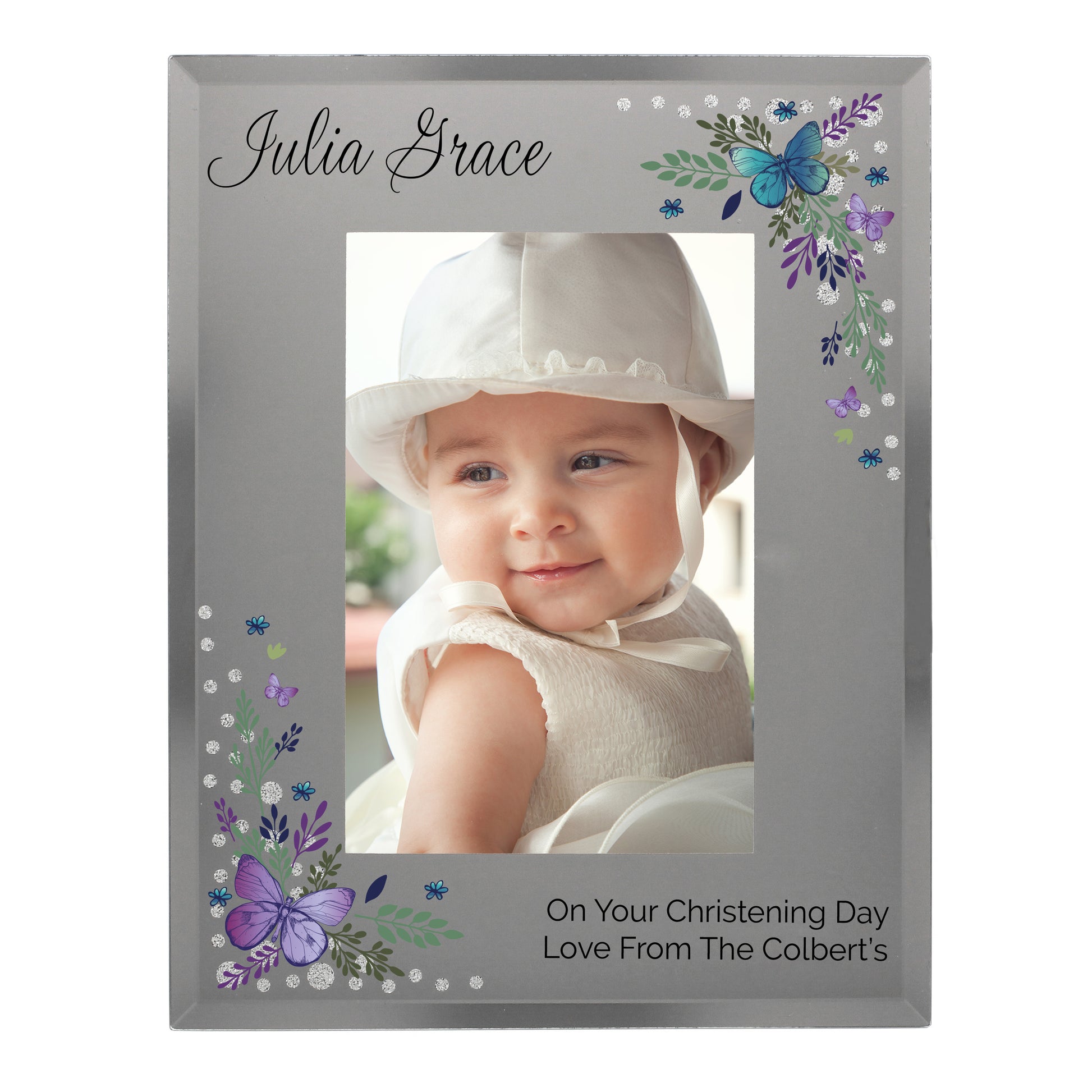 This gorgeous Personalised Butterfly 4x6 Diamante Glass Photo Frame features a gentle mirrored effect and results in a beautiful way to display a photograph.