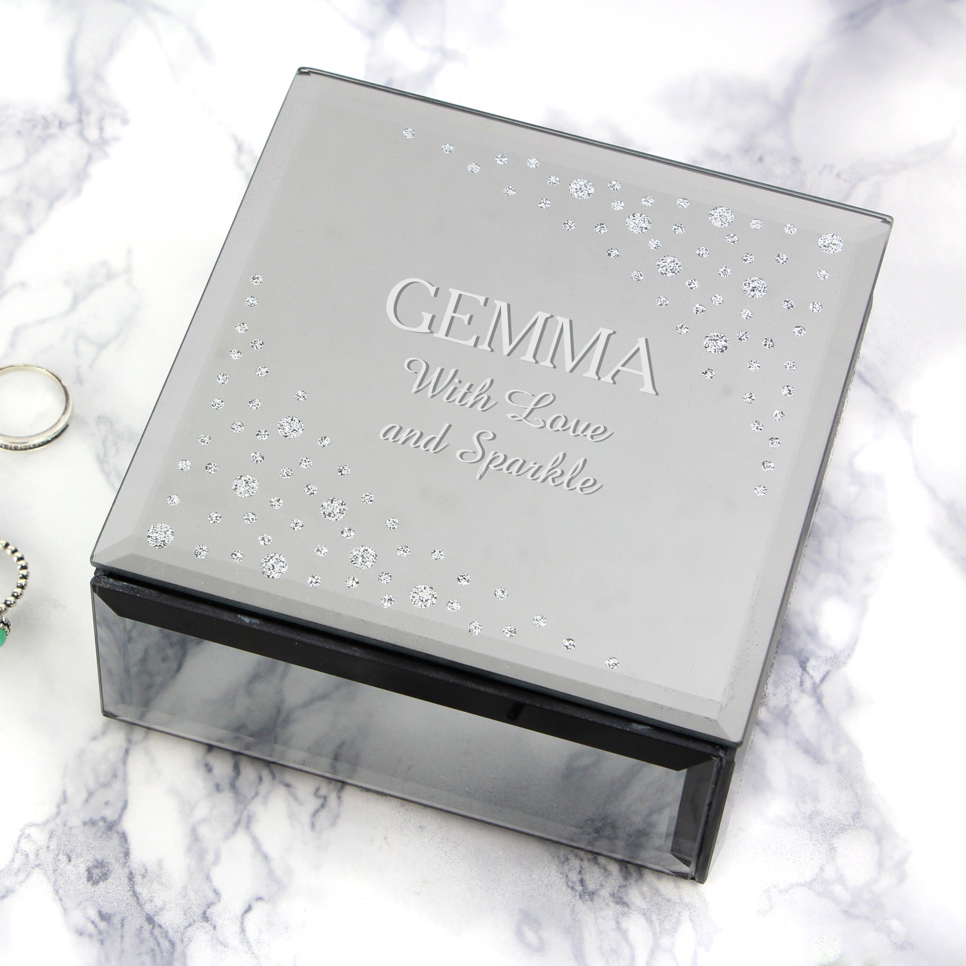 A beautiful diamante effect mirrored Glass Trinket. This item can be personalised with a name of up to 15 characters and any message over 2 lines of up to 20 characters per line. All personalisation is case sensitive and will appear as entered.