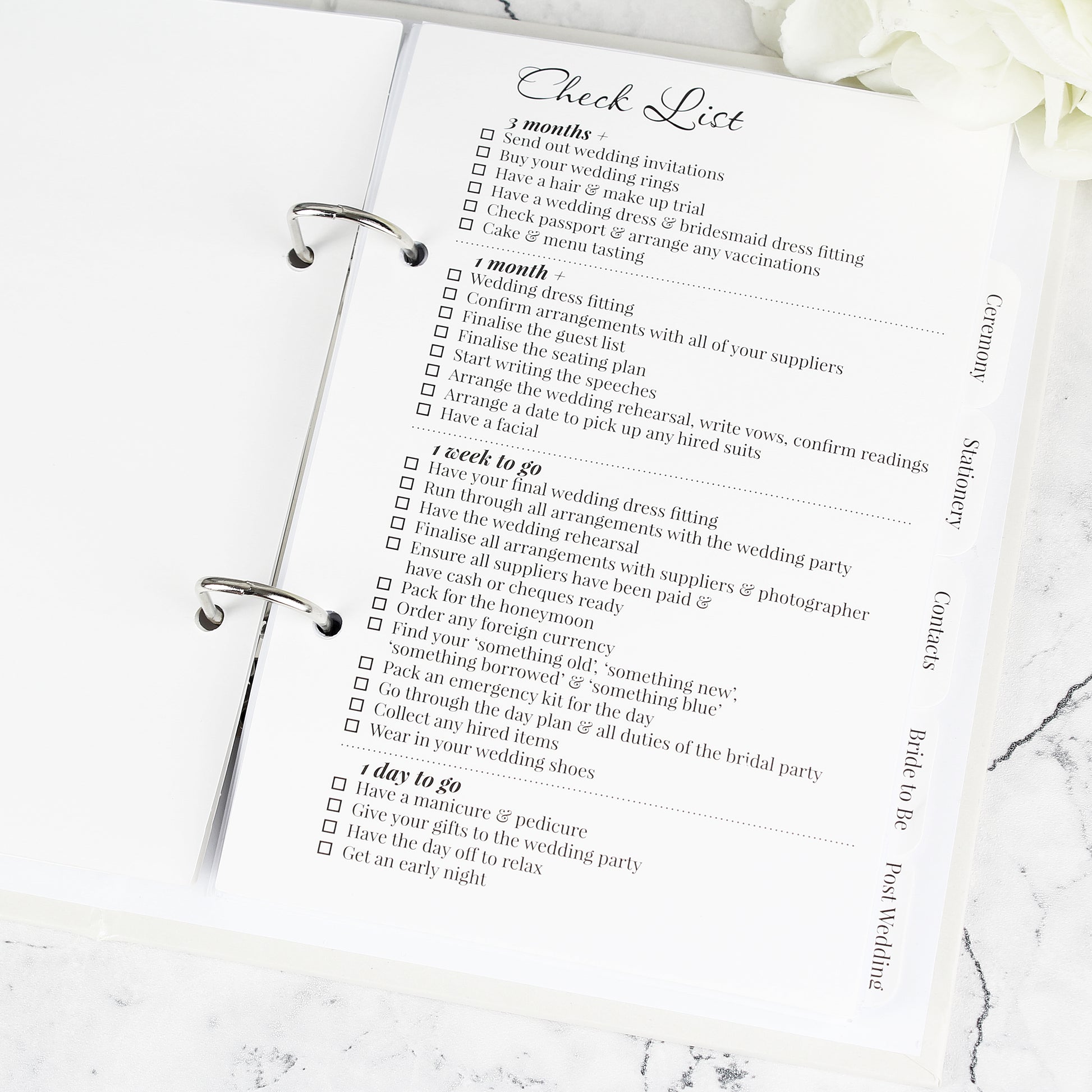 This ring-bound wedding planner includes sections for the ceremony, stationery, contacts, Bride to be and post wedding.