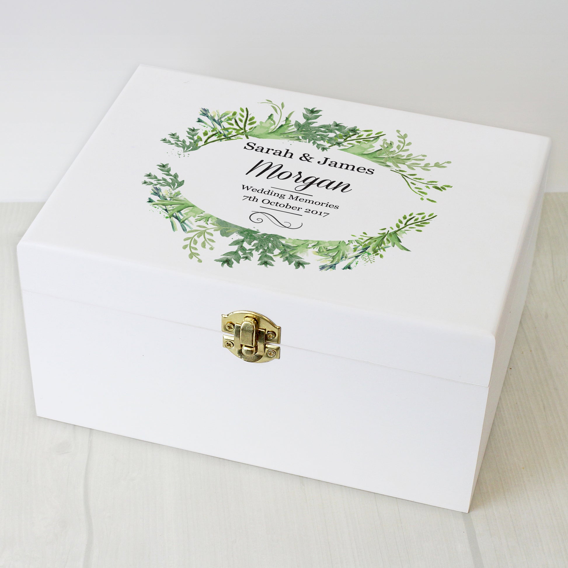Our Personalised Fresh Botanical White Wooden Keepsake Box is perfect for storing precious mementoes of a dream wedding, honeymoon photographs and souvenirs, or even small trinkets or jewellery.