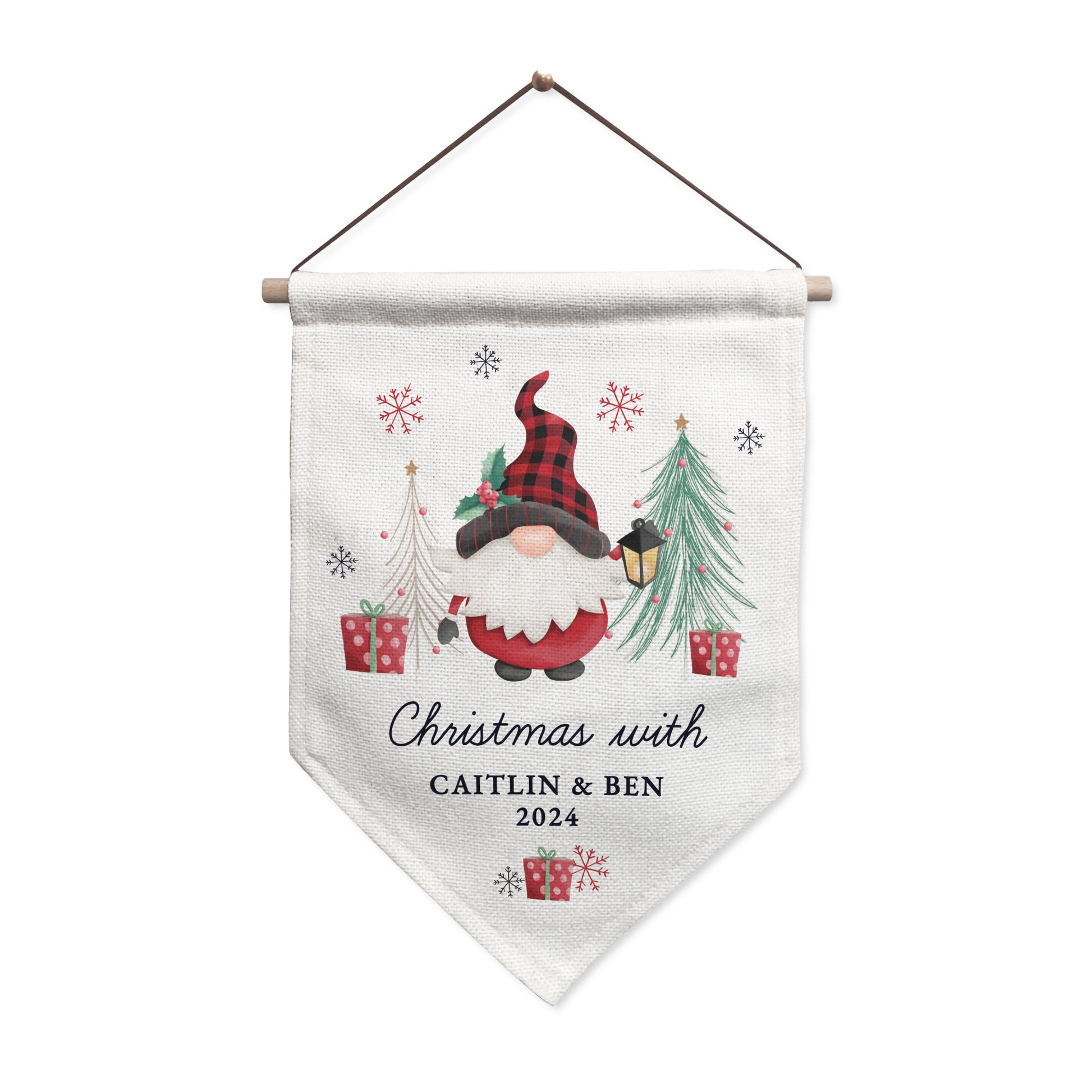 This delightful linen banner features a festive gonk, a beloved Scandinavian Christmas character known for its long beard, pointed hat, and mischievous yet endearing demeanour.