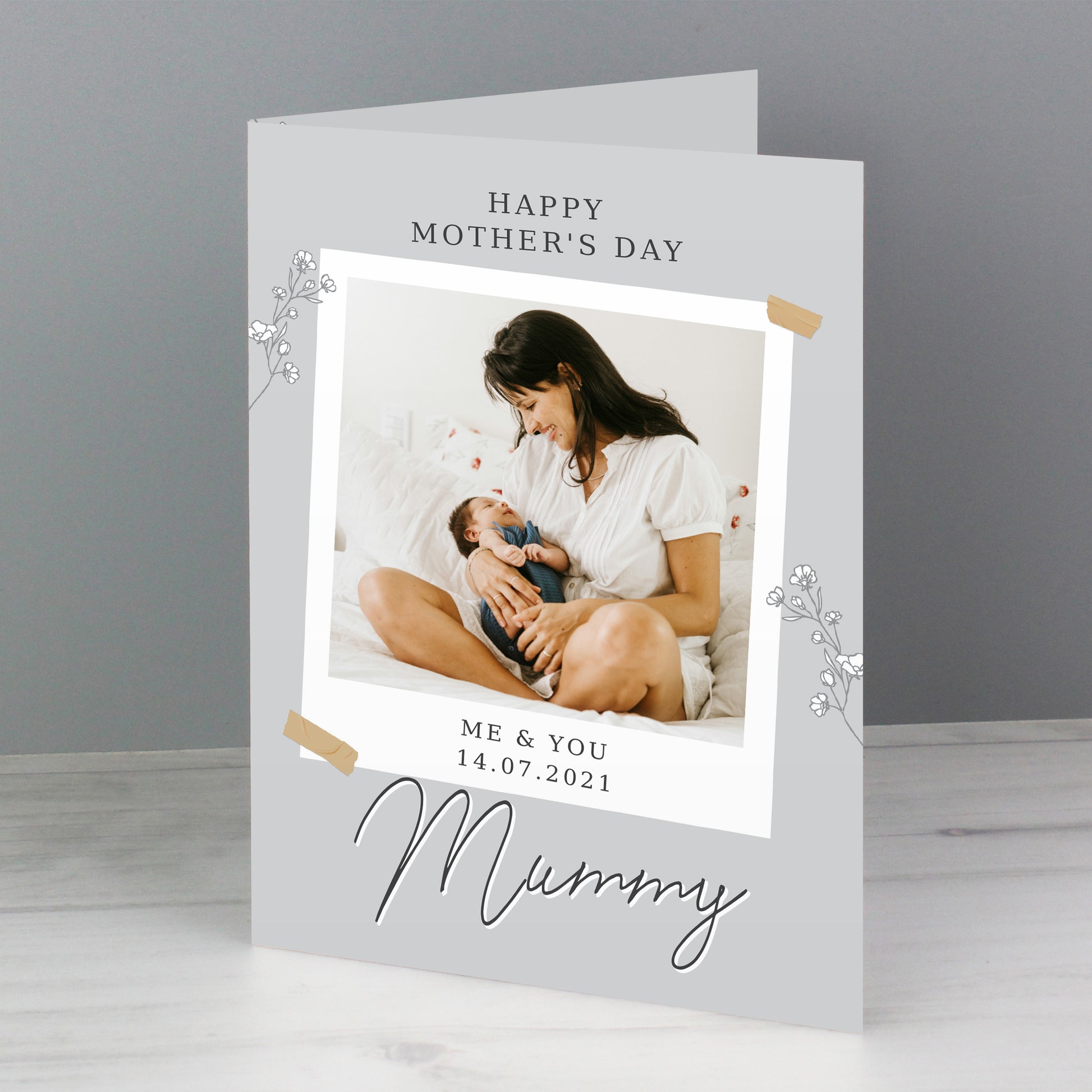 Add your favourite photograph to this lovely grey floral card to make it unique!