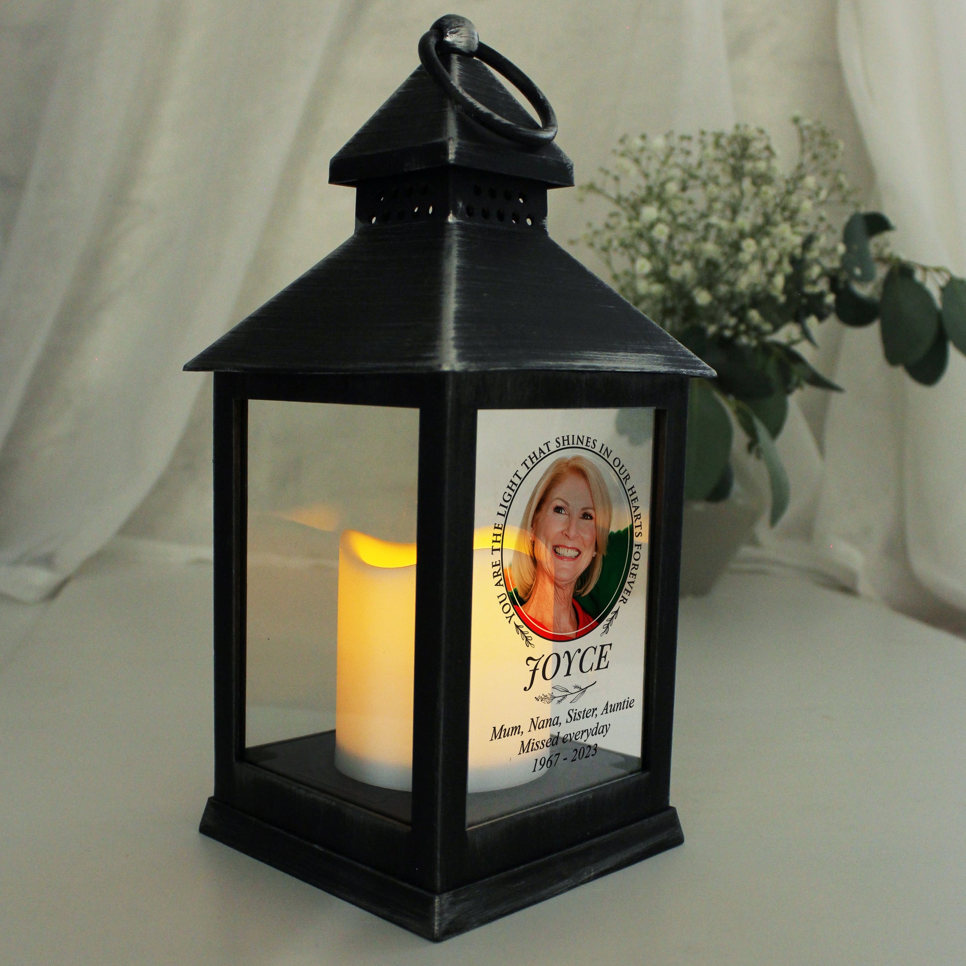This Personalised Light In Our Hearts Photo Upload Black Lantern is a unique way to remember loved ones.