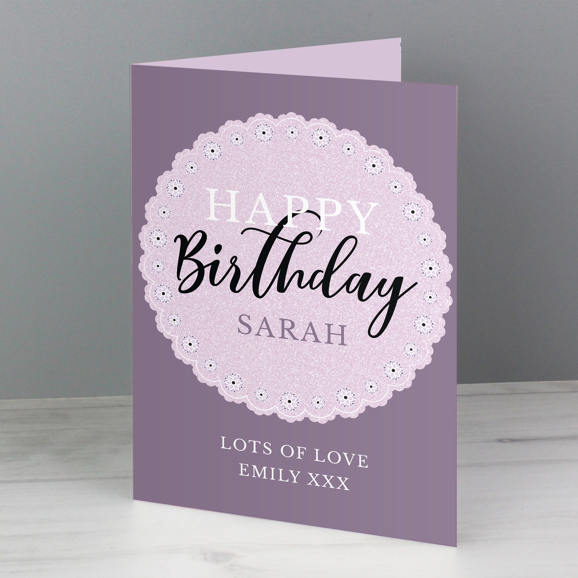 Celebrate a special Birthday in style with this Personalised Lilac Lace Birthday Card!