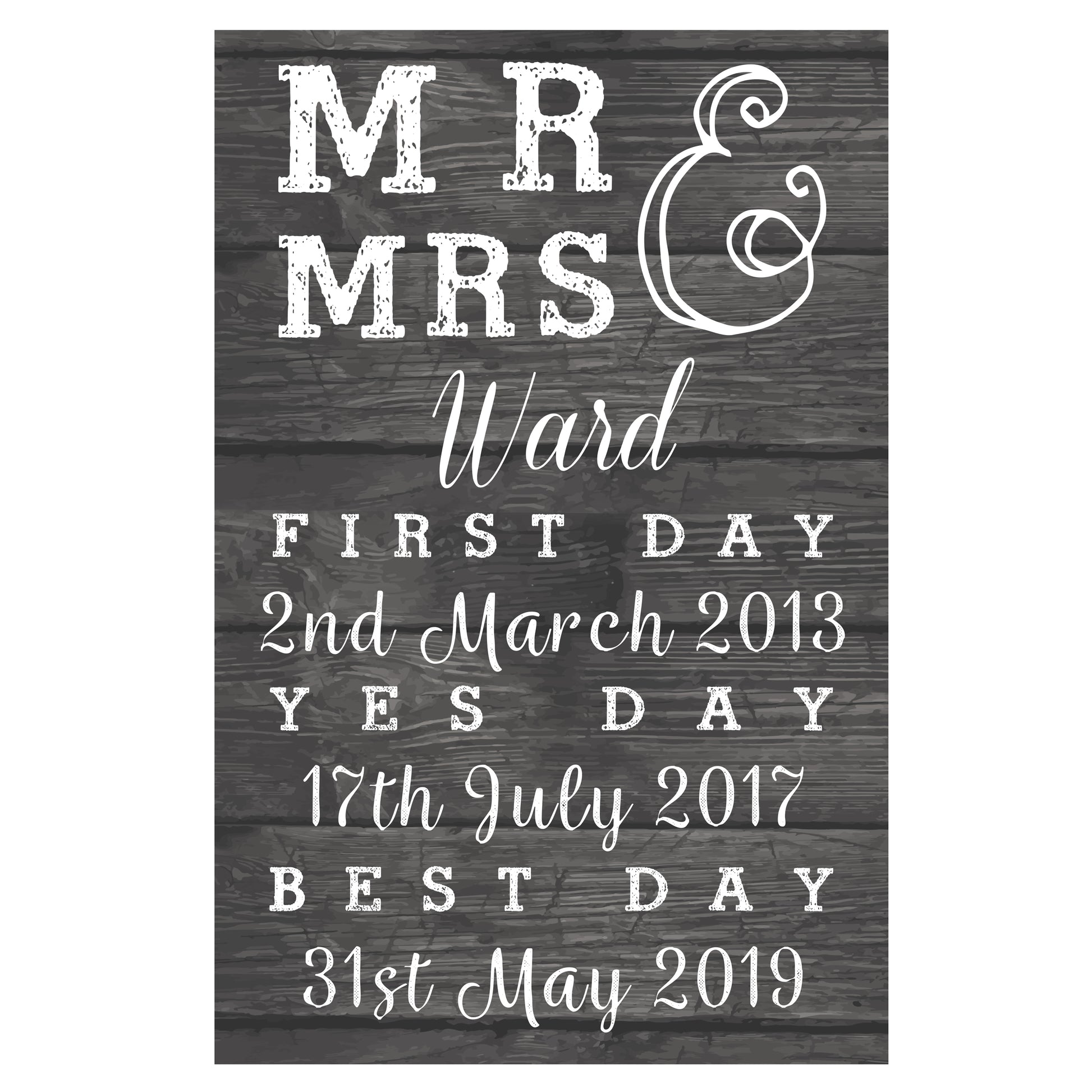 The sign can be personalised with up to 4 lines of text, with a maximum of 15 characters per line. The first line will be the surname of the couple. The second line will be the first date. The third line will be the engagement date with the fourth line being the wedding date.