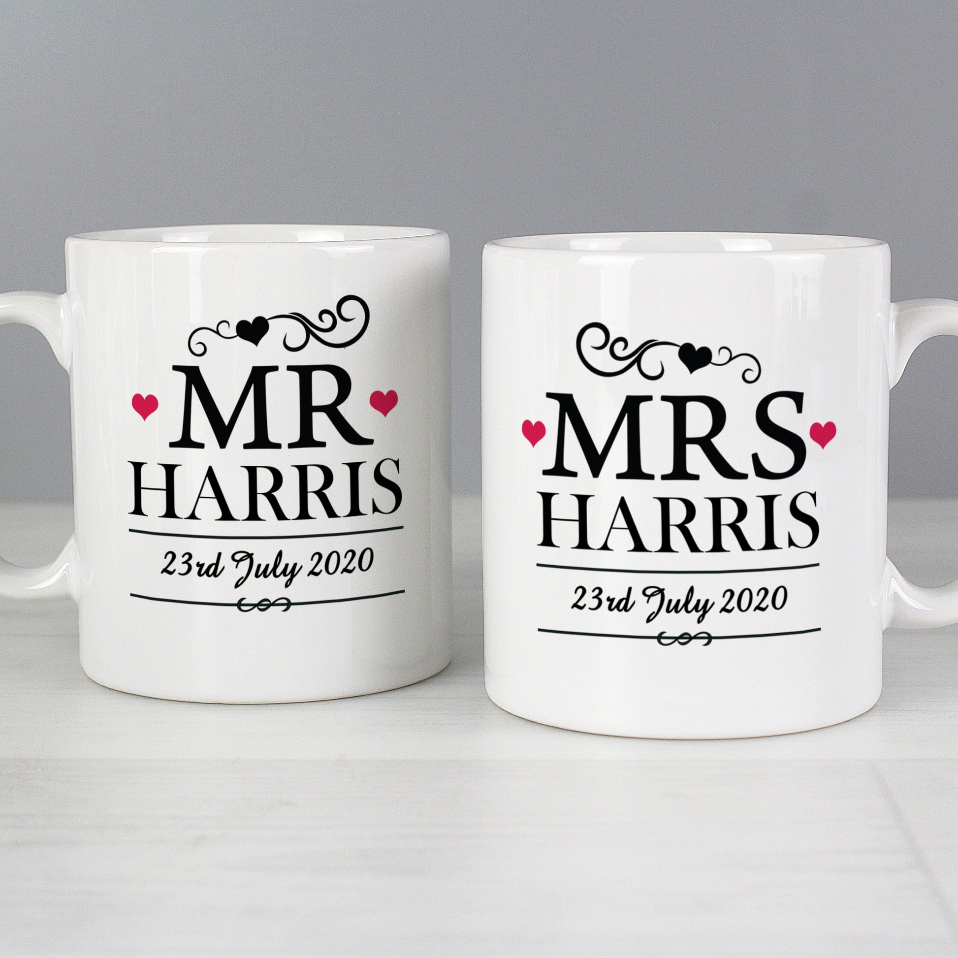 Personalise this Mr & Mrs Mug Set with a surname up to 15 characters and date up to 20 characters.
