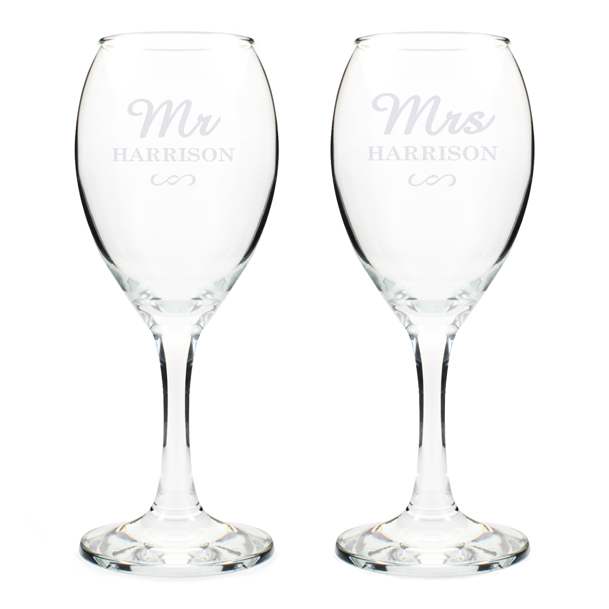 Both of these personalised Mr & Mrs Wine Glasses can be personalised with a surname up to 12 characters long, which will appear on both glasses.