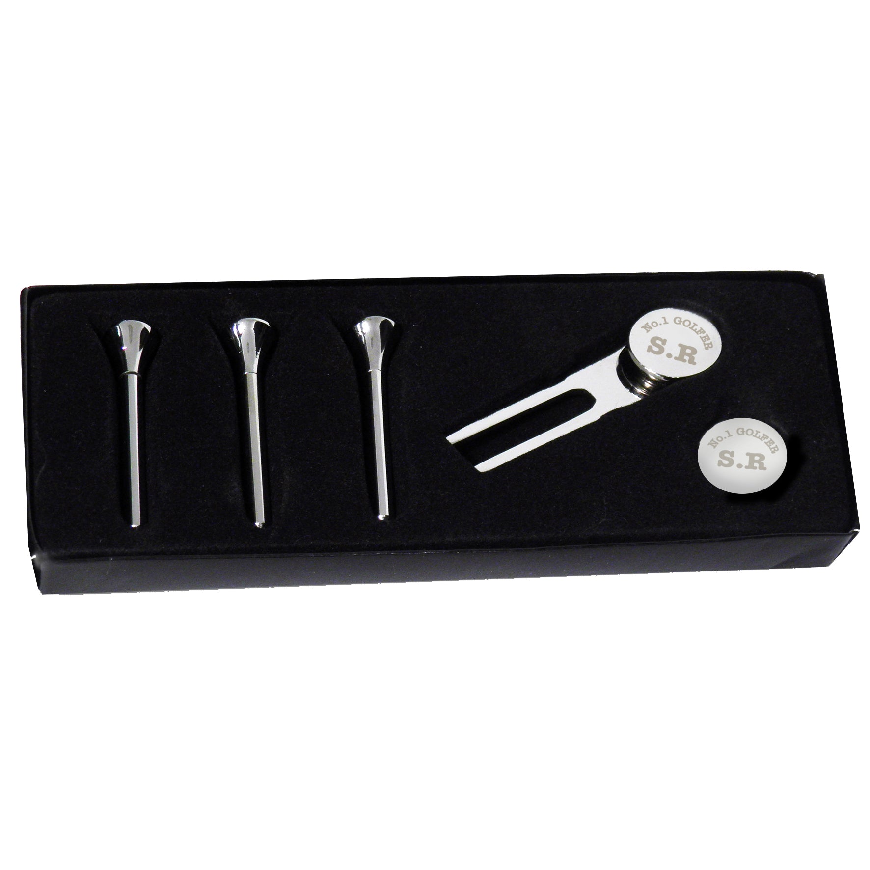 The No.1 Golfer Golf Set comprises of 3 tees, a pitch repairer and a ball marker with interchangeable disc which can be engraved with up to 3 initials and 3 full stops.