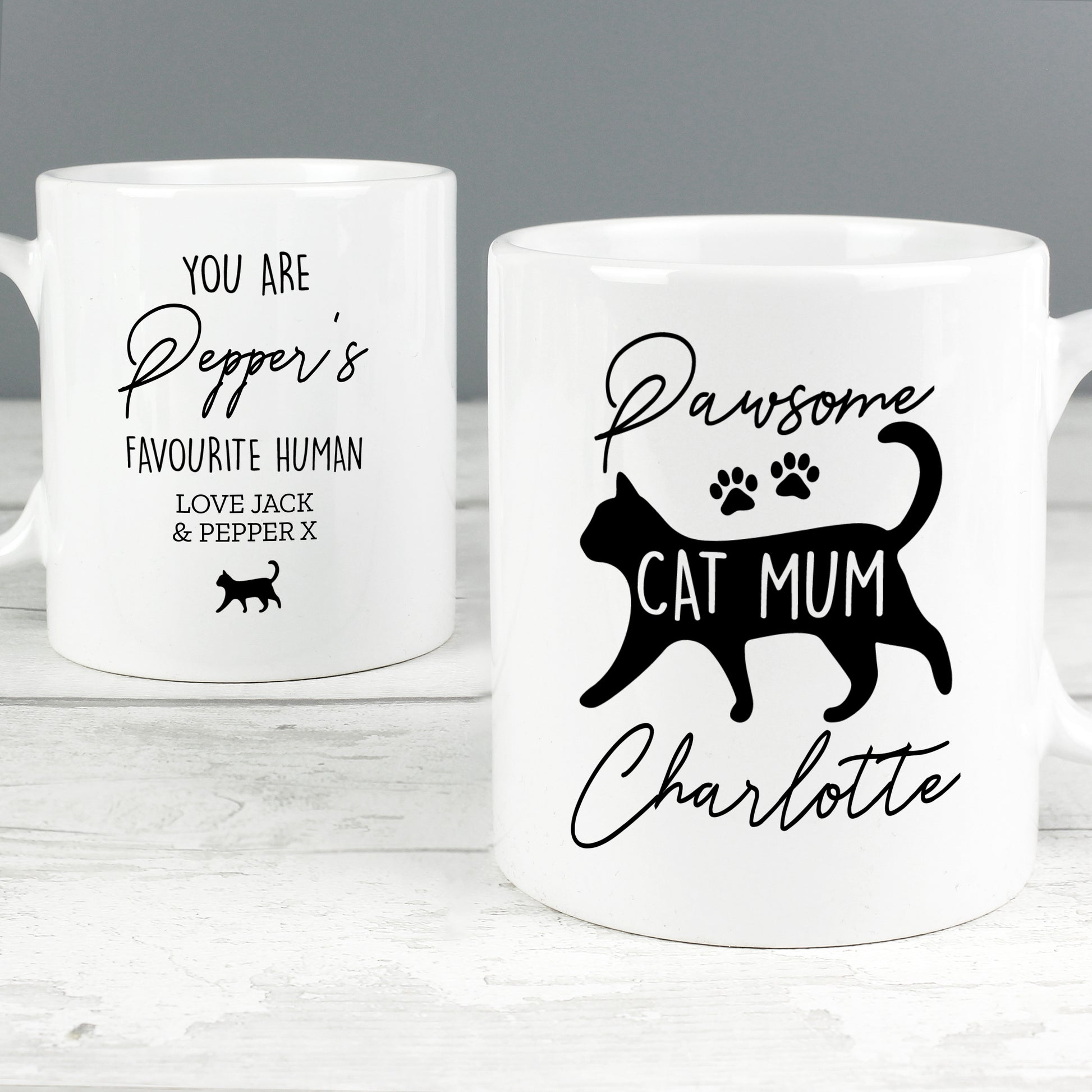 The back of the mug can be personalised with the cats name with up to 12 characters available and a message over 2 lines, with up to 20 characters per line.