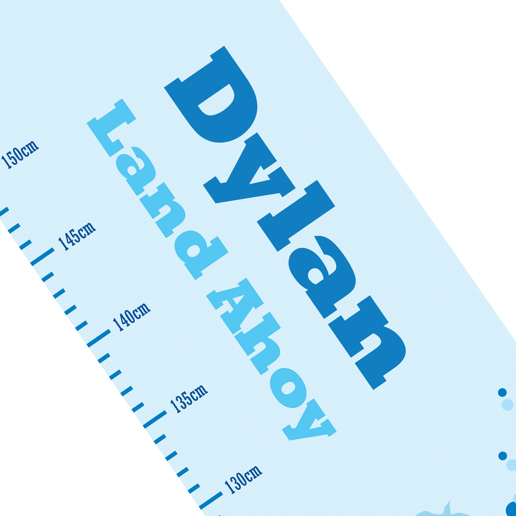 Personalise this Pirate Height Chart with a name using up to 12 characters and small message using up to 15 characters (for example, 'Land Ahoy' 'Happy Birthday' 'Growing fast' 'Love Mum and Dad').