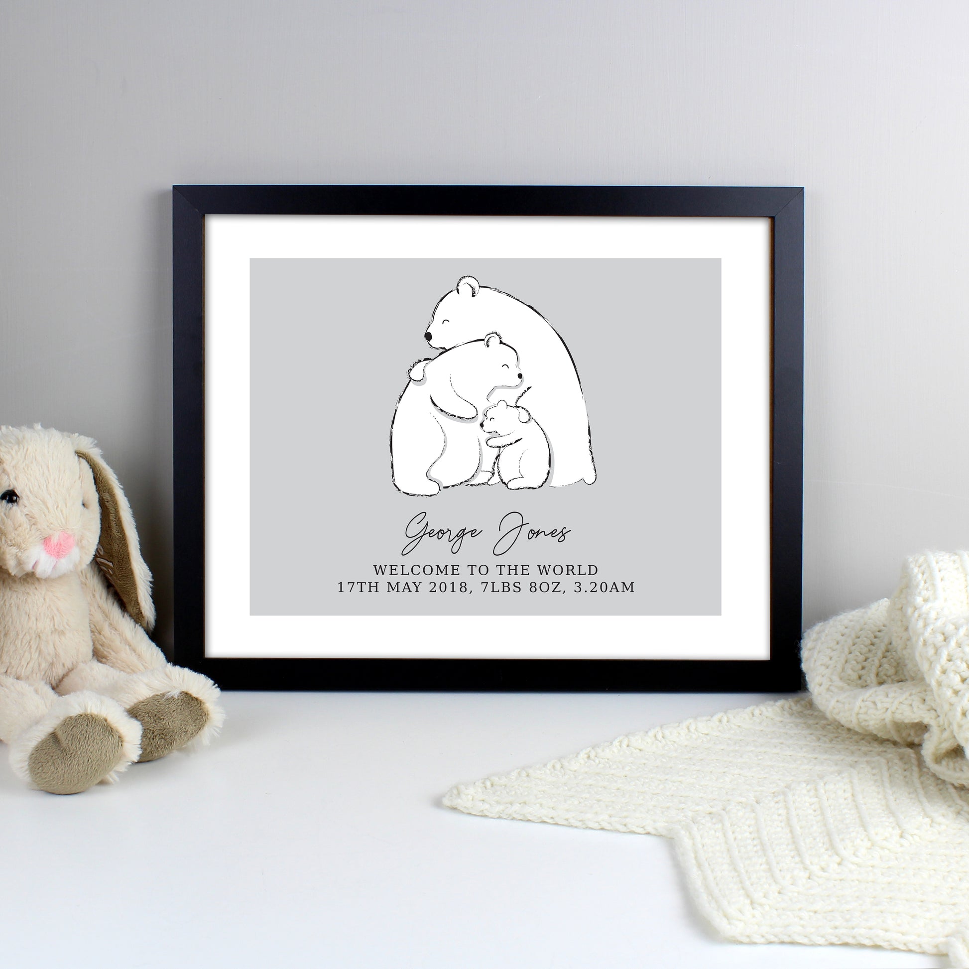 Let people know how much you love your little family, with this personalised framed print, featuring three polar bears.