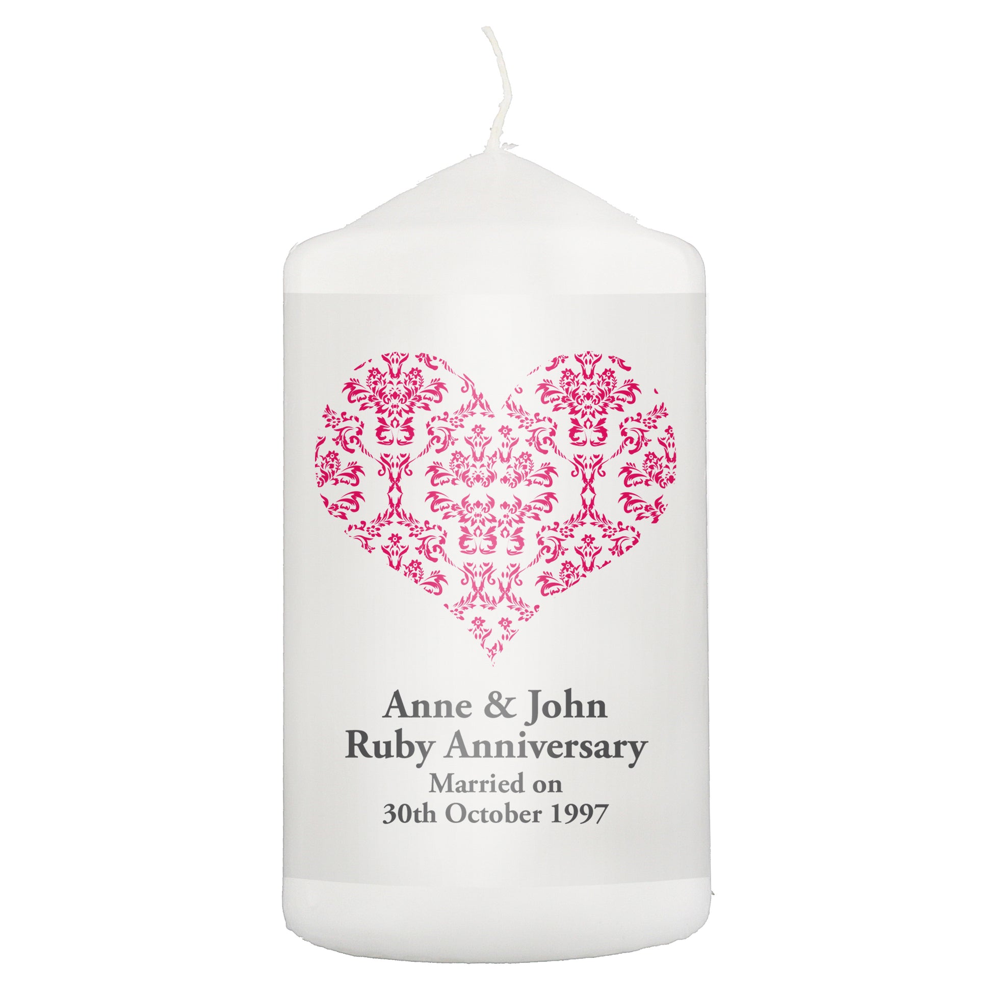 Personalise this red damask heart candle over 4 lines up to 20 characters per line. The first two lines are in bold.