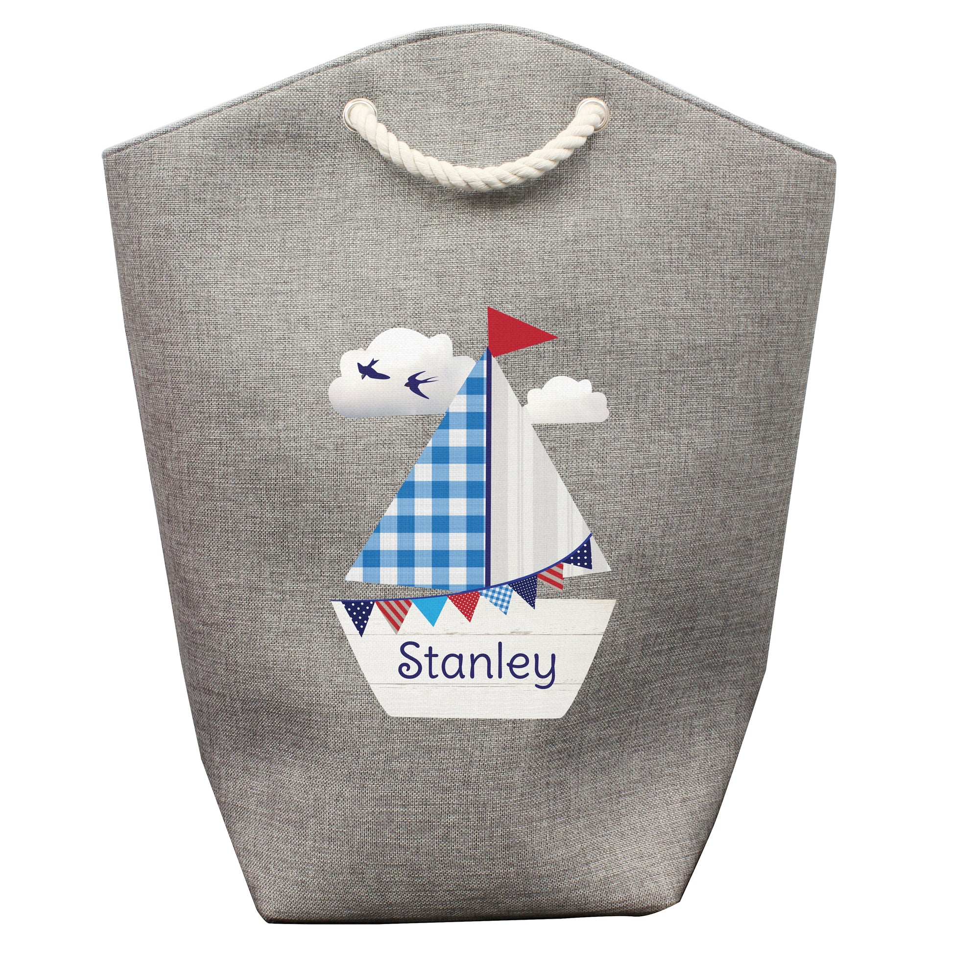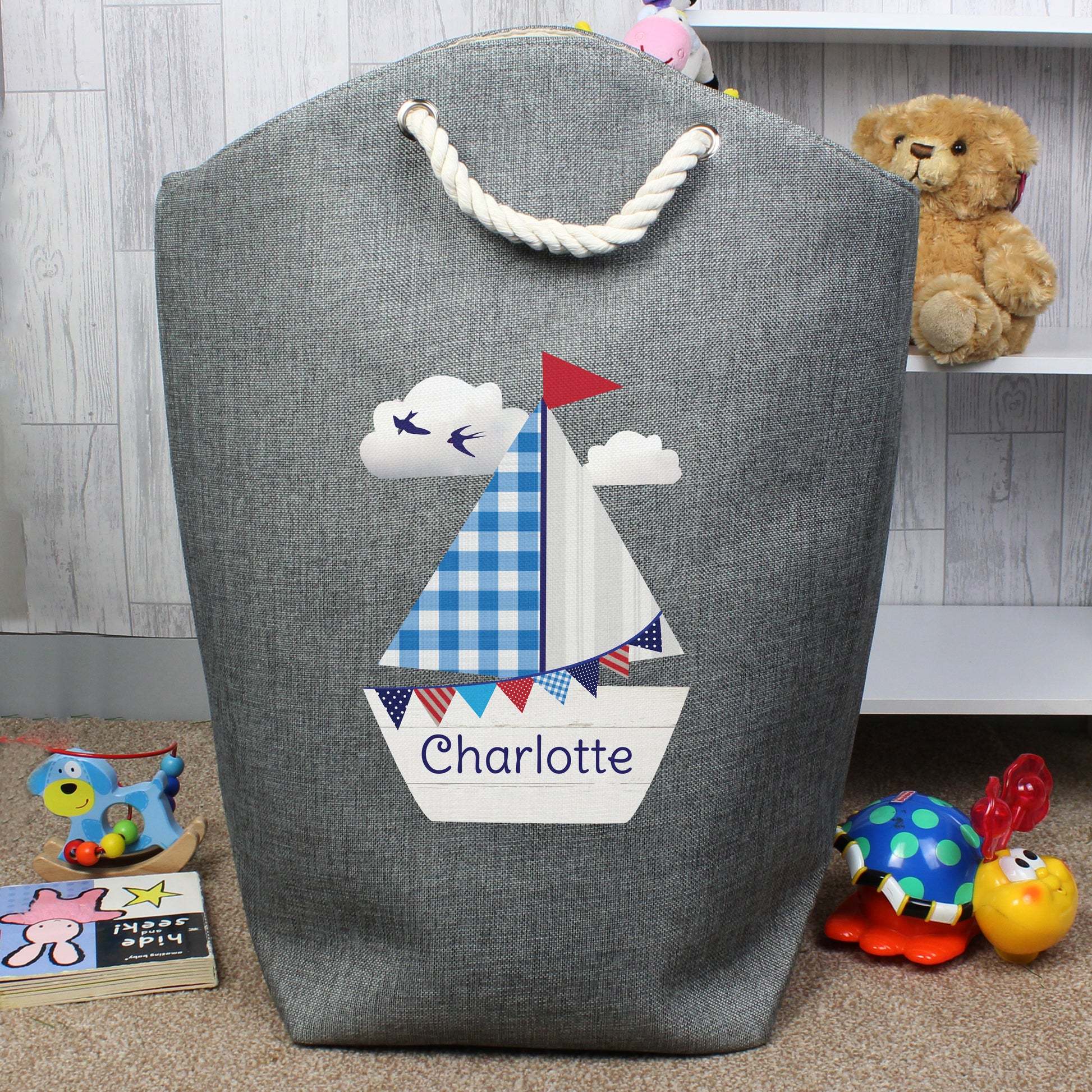 Our Personalised Sailboat Storage Bag is perfect for keeping a bedroom or bathroom tidy. It's ideal for storing toys or even for use as a laundry bag.