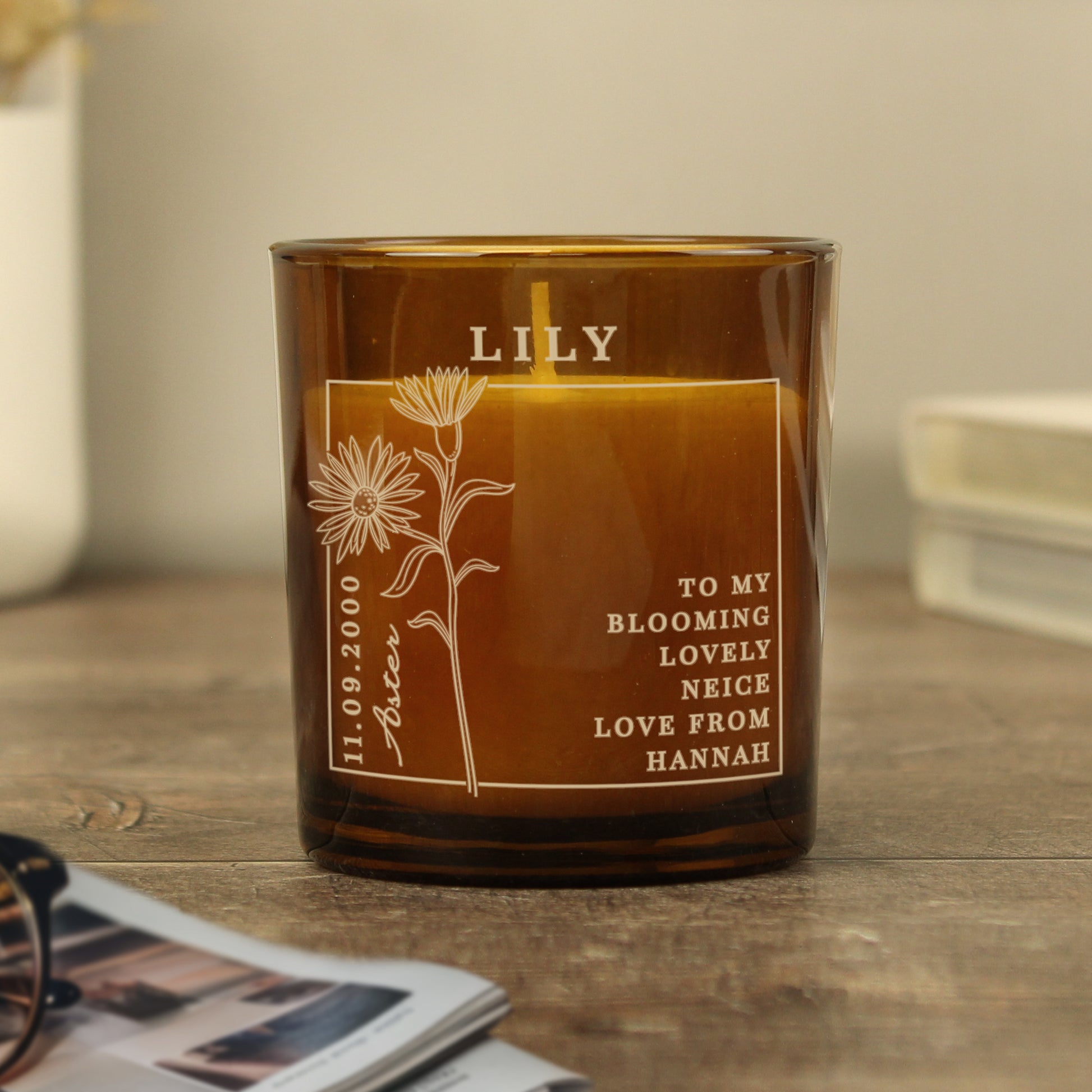 Our personalised September Birth Flower amber glass vanilla scented candle jar is the perfect gift for commemorating a Birthday!