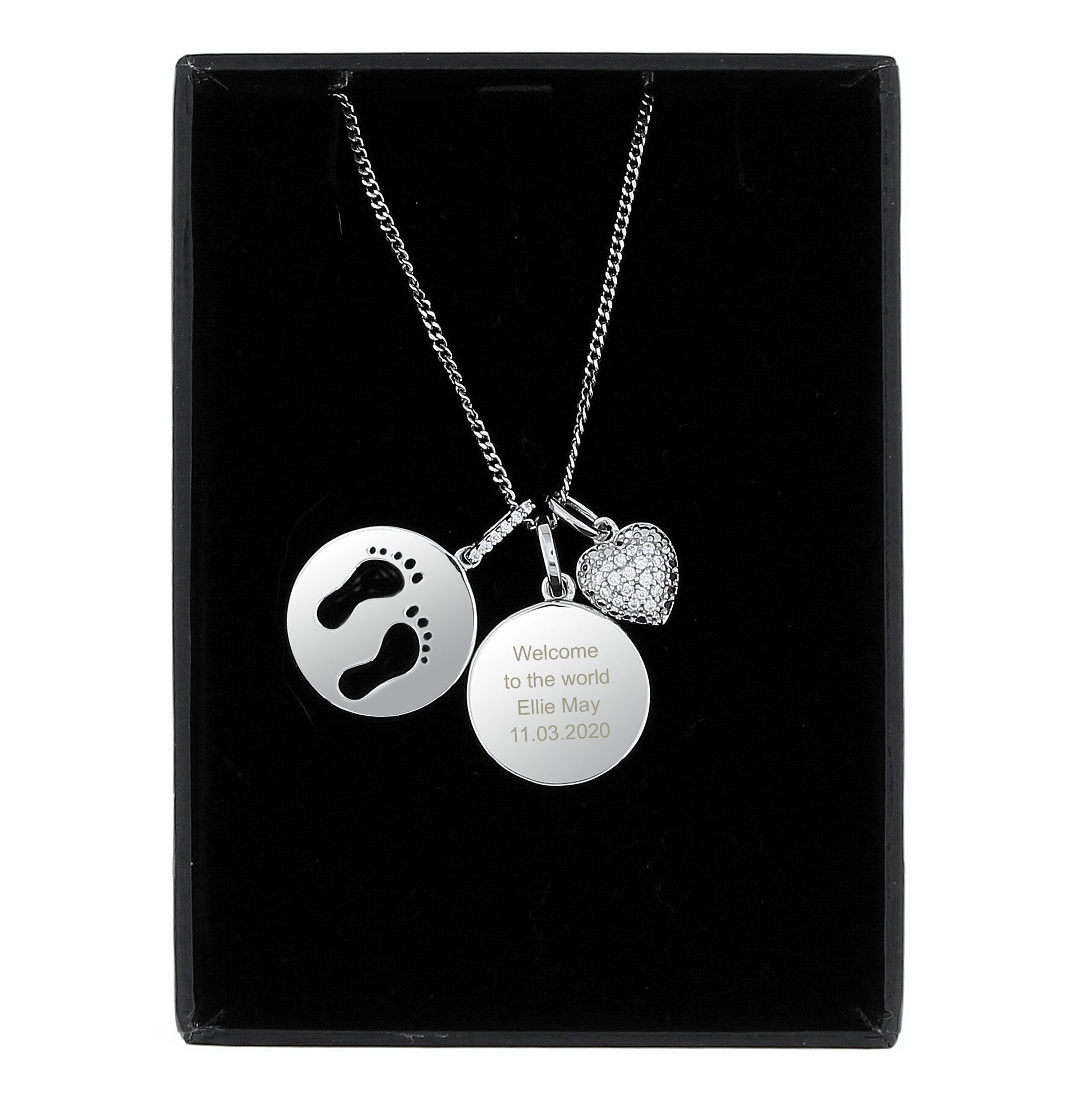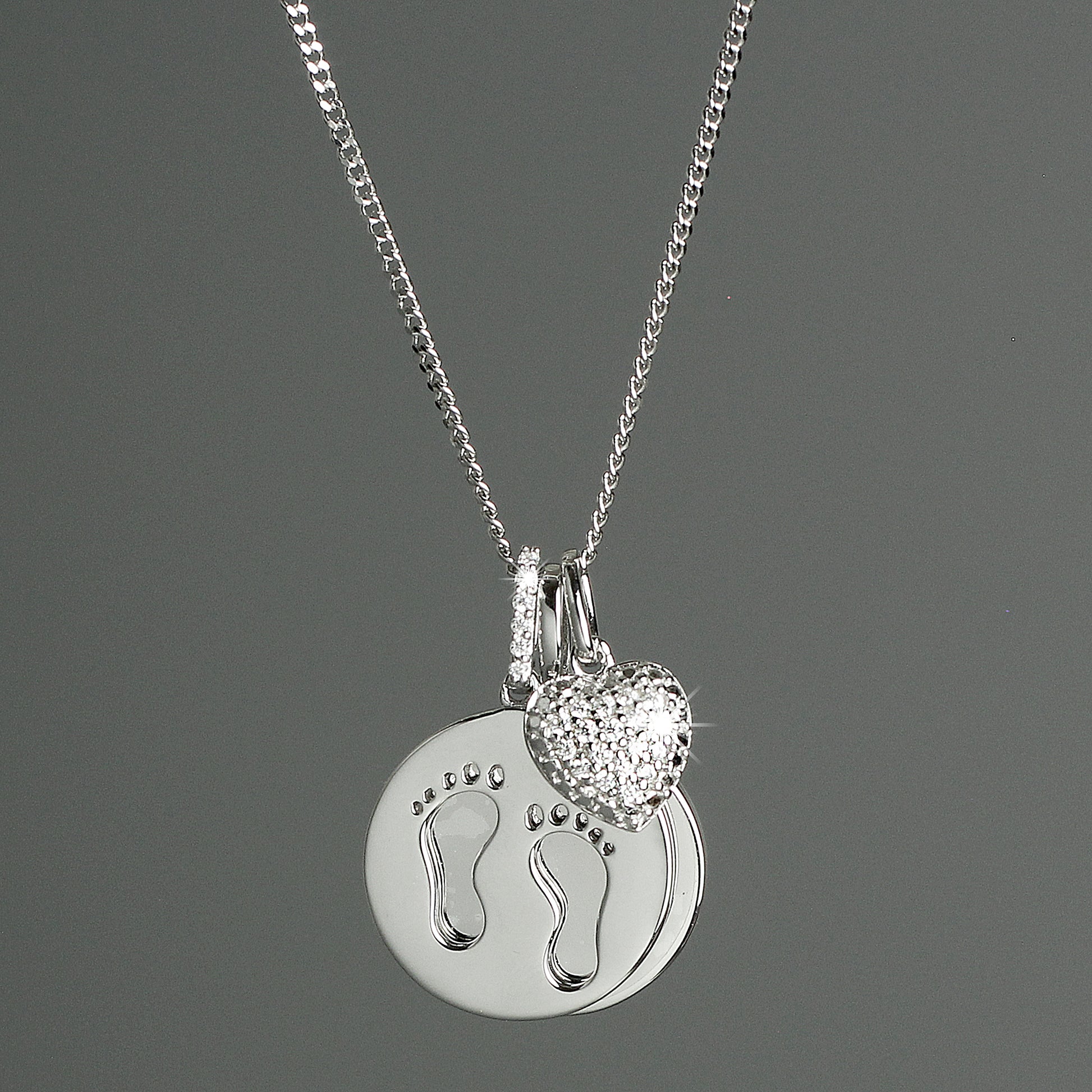 Personalised Sterling Silver Footprints and Cubic Zirconia Heart Necklace