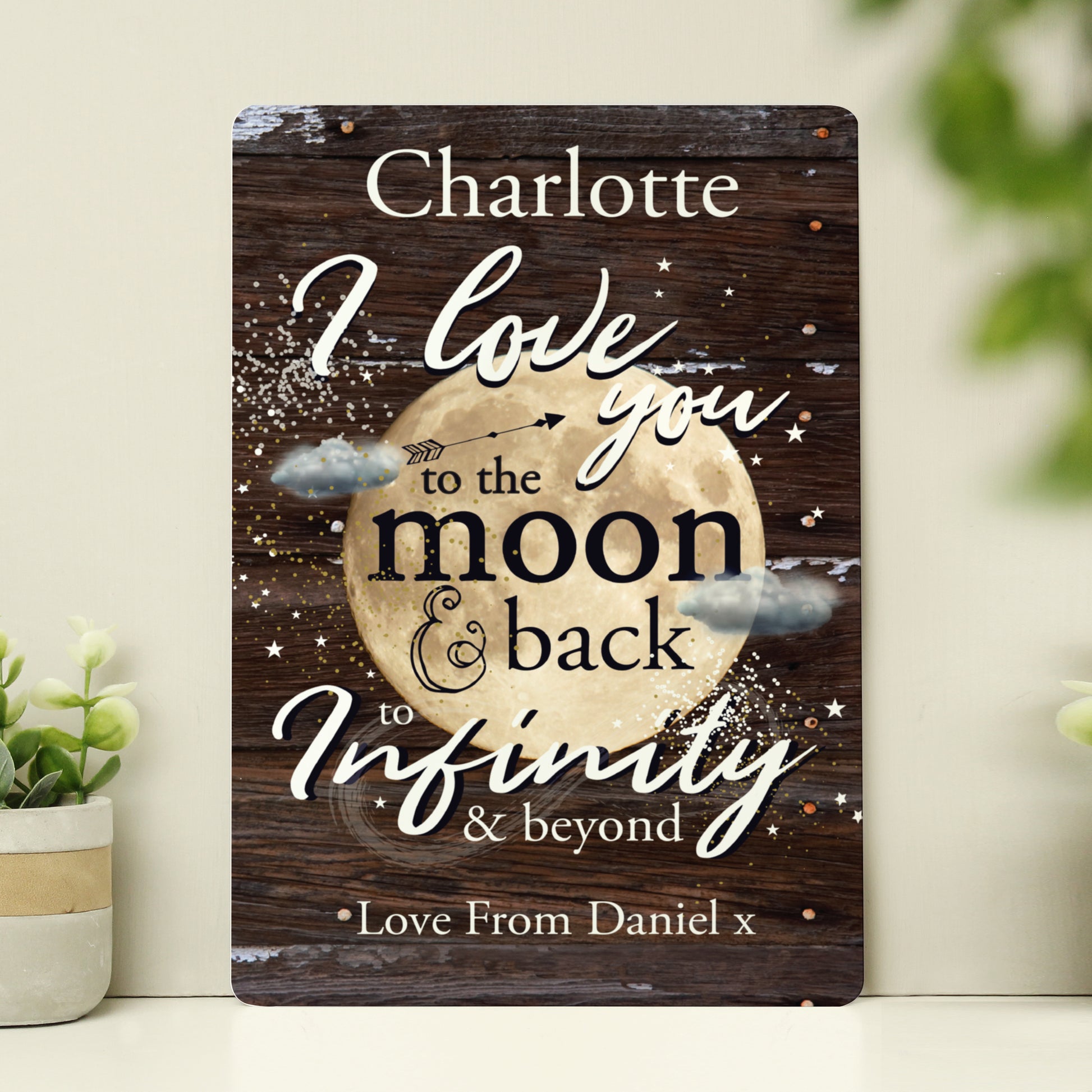 You can personalise this sign with a name at the top up to 12 characters and then a line of text at the bottom up to 25 characters in length. The words 'I love you to the moon & back to infinity & beyond' are fixed.