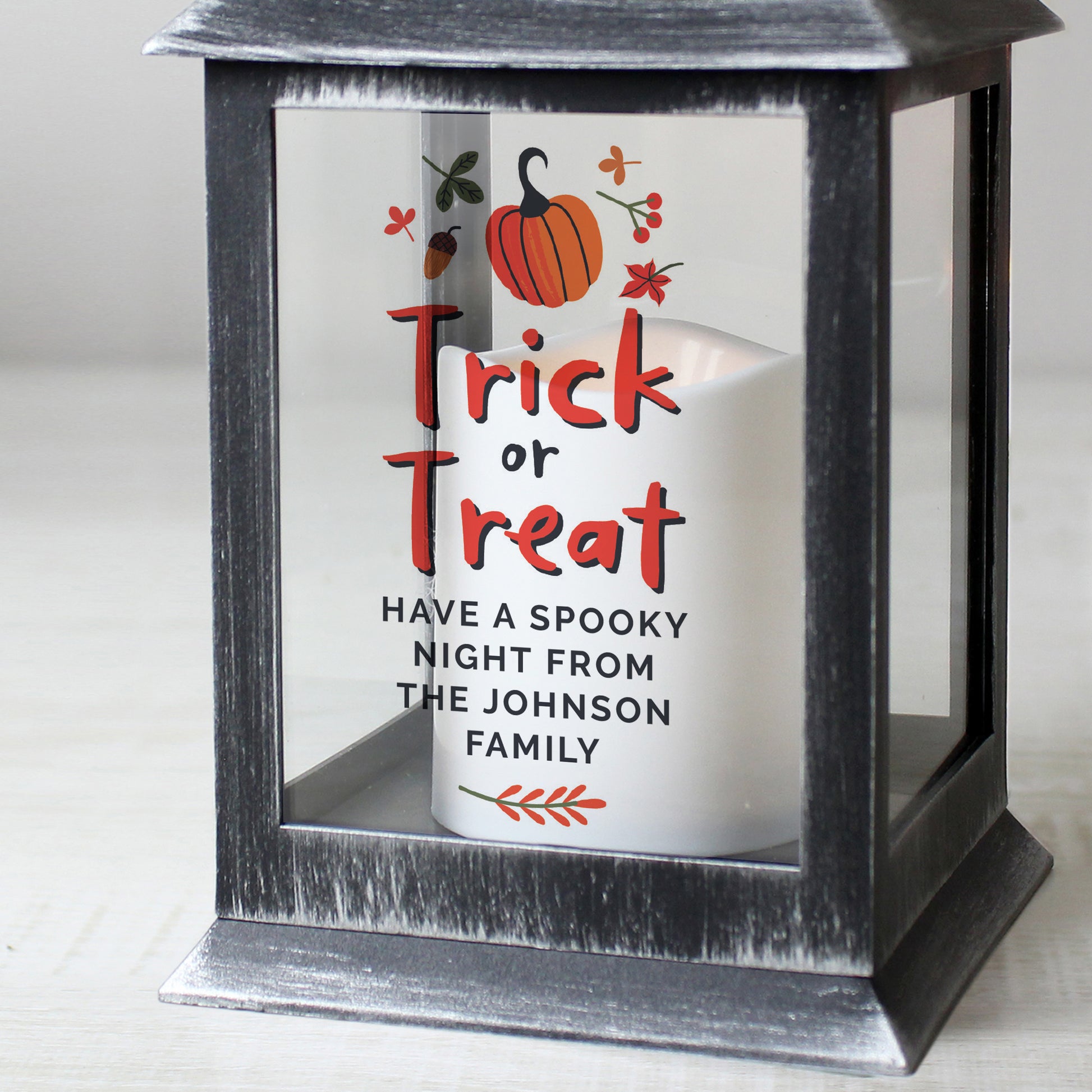 This stunning personalised Trick or Treat lantern is an ideal way of celebrating Halloween! Perfect for indoor or outdoor use on Halloween to let the Trick or Treaters know you have sweeties!