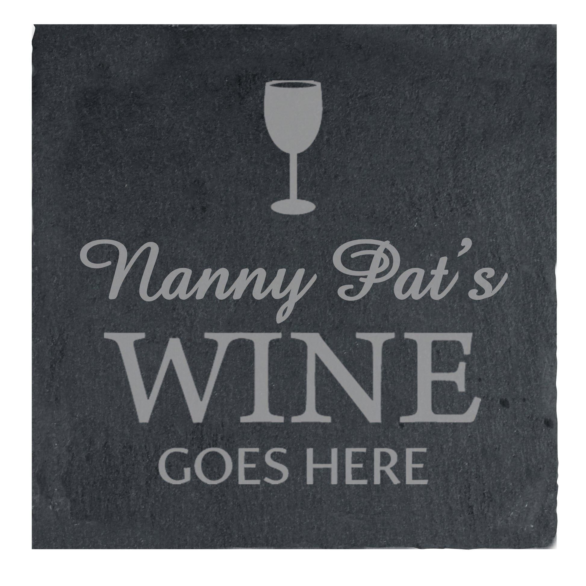 The wine glass motif and wording 'WINE GOES HERE' is a fixed part of the design.