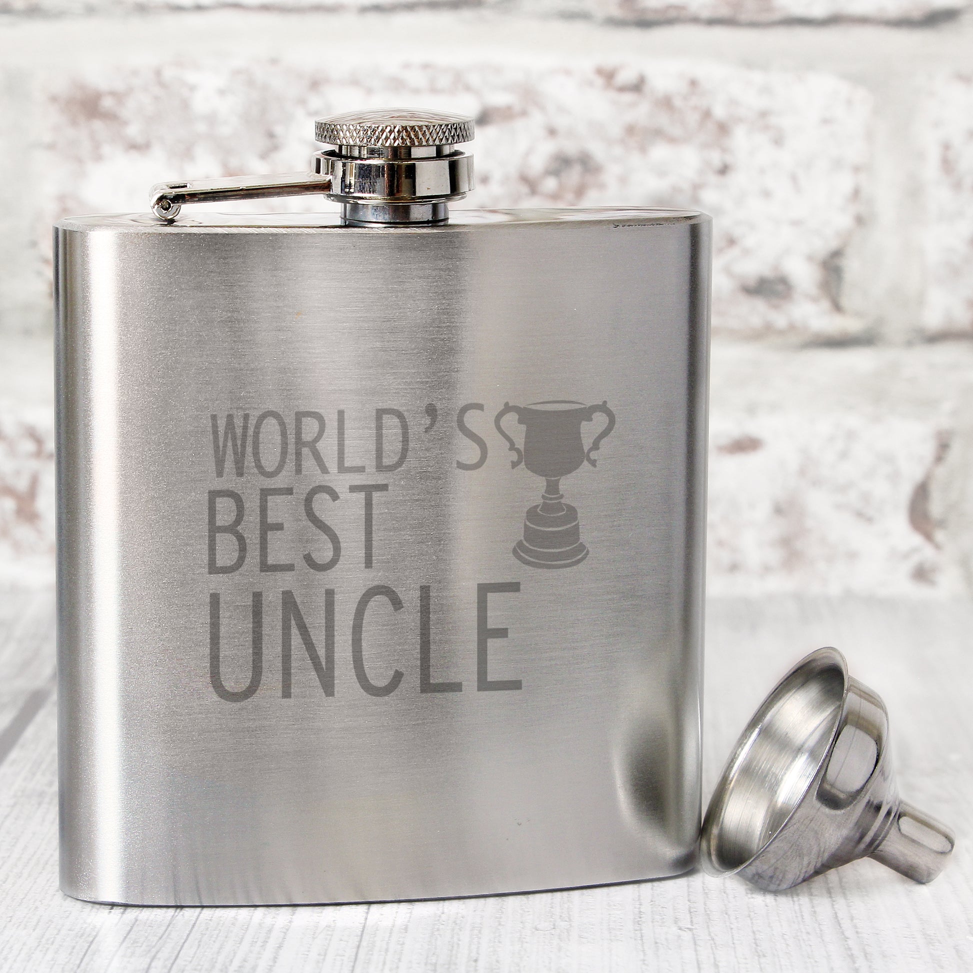 6 oz. stainless steel Hip Flask with the wording 'Word's Best Uncle' featuring a trophy motif.